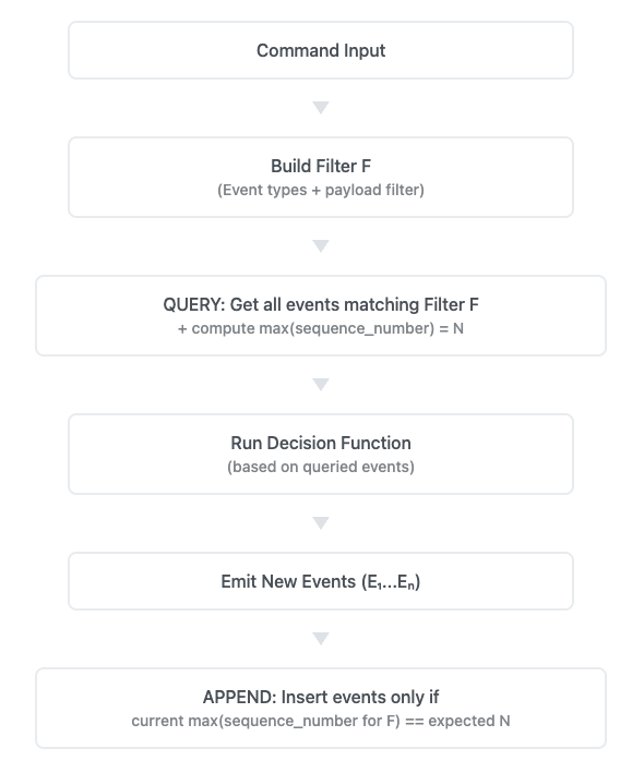 When the command emits new events, it includes the same filter and the maxSequenceNumber observed. The append will only succeed if the number hasn't changed, meaning that no relevant events have been added in the meantime.