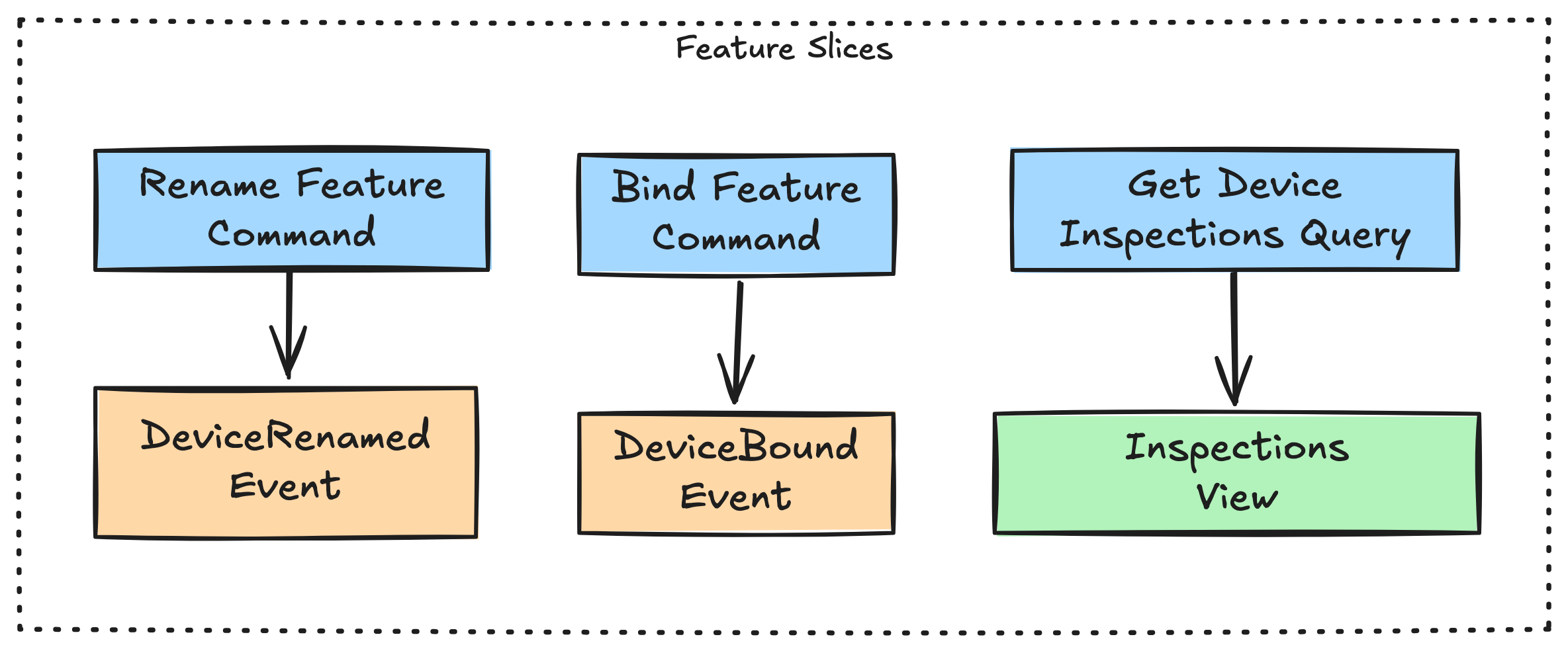If a DeviceRetired event occurs, it is visible to all. Every feature slice can query it. But how you interpret that event? That’s contextual. That belongs to the feature.