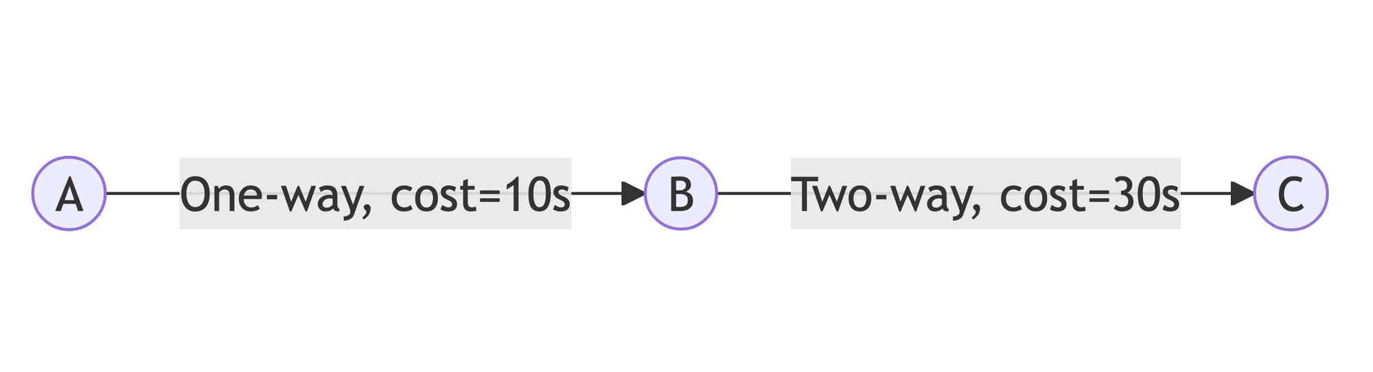 - Access rules. Some edges are available only to certain users. Bus lanes, tram tracks, pedestrian streets, and restricted industrial roads all fall into this category. These are either removed from the graph for unauthorized modes or given prohibitively high costs.