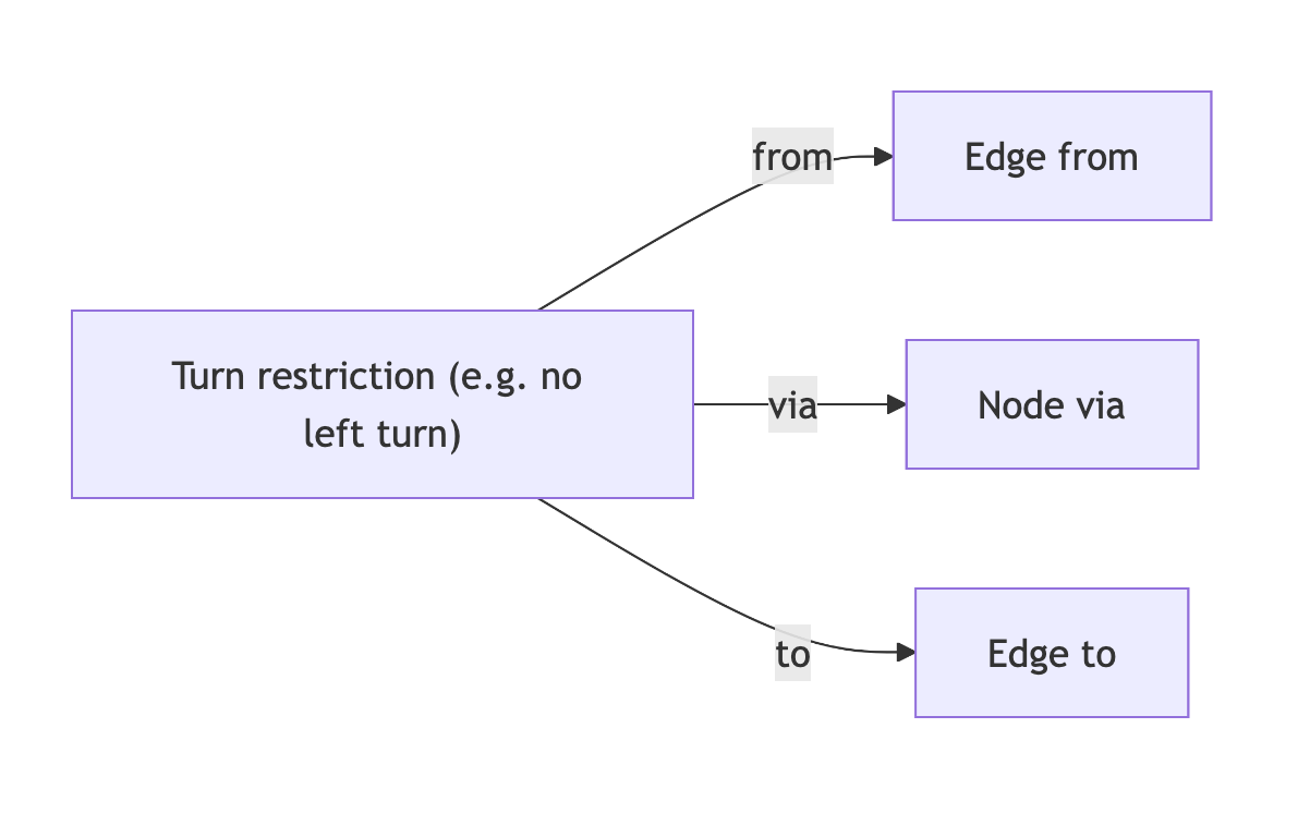 - Turn restrictions. At intersections, not every movement is allowed. You may be able to turn right or go straight, but not left. Or U-turns might be forbidden. In graph terms, this means that not every pair of incoming and outgoing edges at a vertex forms a valid connection. Routing engines must check turn restrictions whenever they compute paths.
