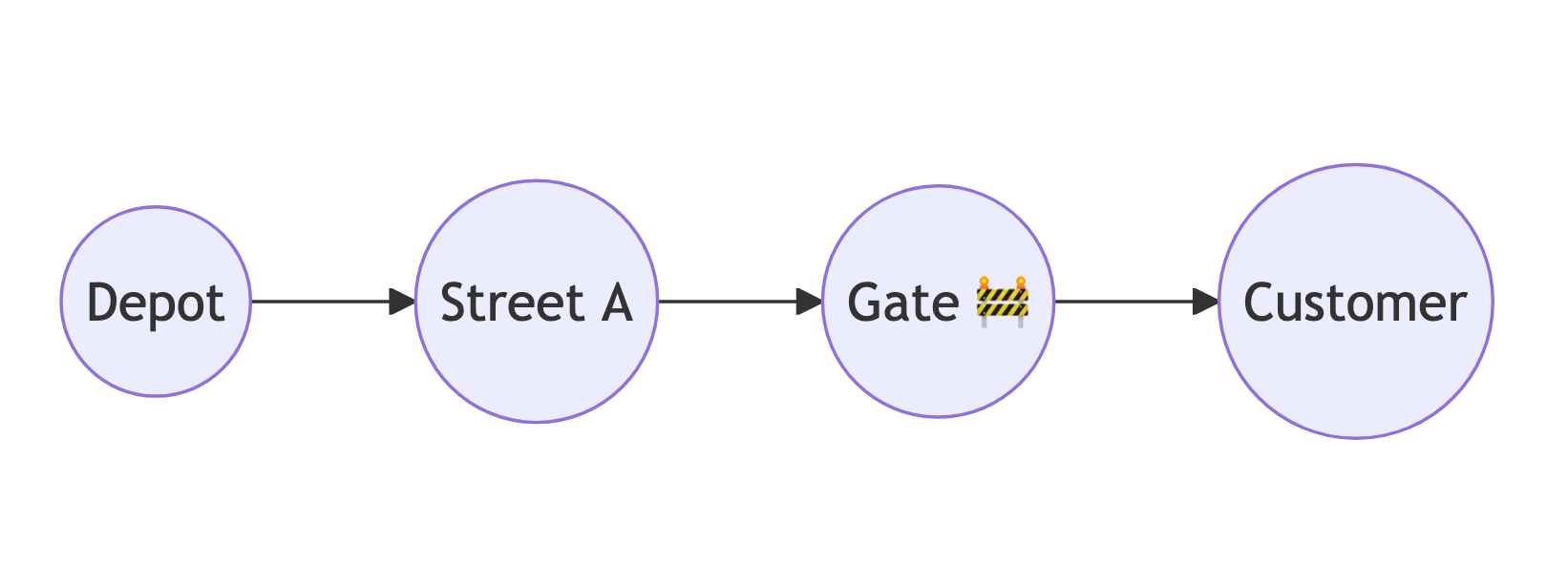 - Barriers. Some vertices are blocked: a bollard in a pedestrian zone, a gate to a private property, or a barrier that allows bicycles but not cars. These nodes effectively stop traversal. In the network, such vertices either connect to no edges for that vehicle type or carry infinite cost.